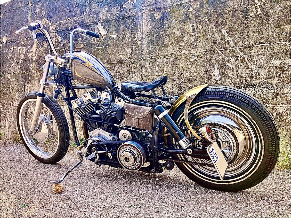 Telaio originale del 1982, forcellone tubolare e tamburo idraulico posteriore di una Electra del ’68, ruota da 16″ resa esteticamente massiccia con borchie inox Hammer Sycle.
